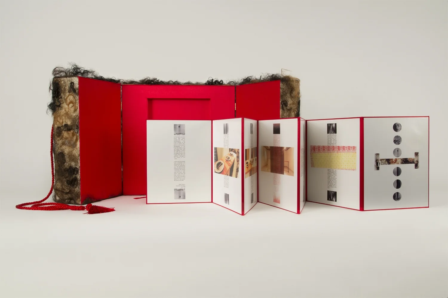 Mixed media: wood, red satin fabric, bronze-cast nipples, human hair, dye-sublimation digital prints.